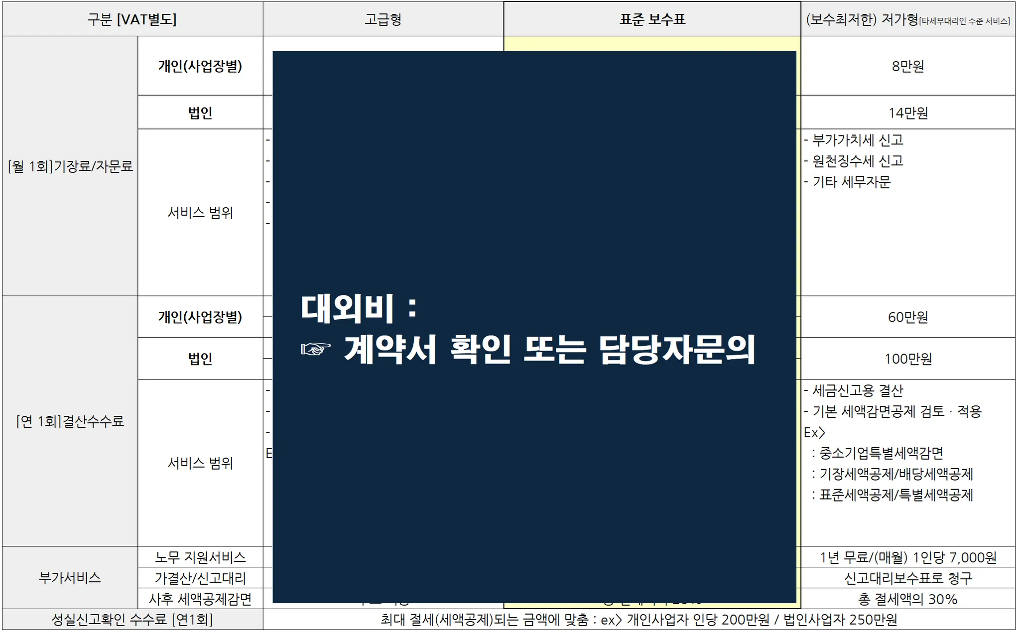 성실신고확인수수료는 별도이며, 주대표자가 세액공제액을 최대한 받는 수준으로 책정됩니다. (ex. 개인(인당) 200만원/ 법인 250만원)